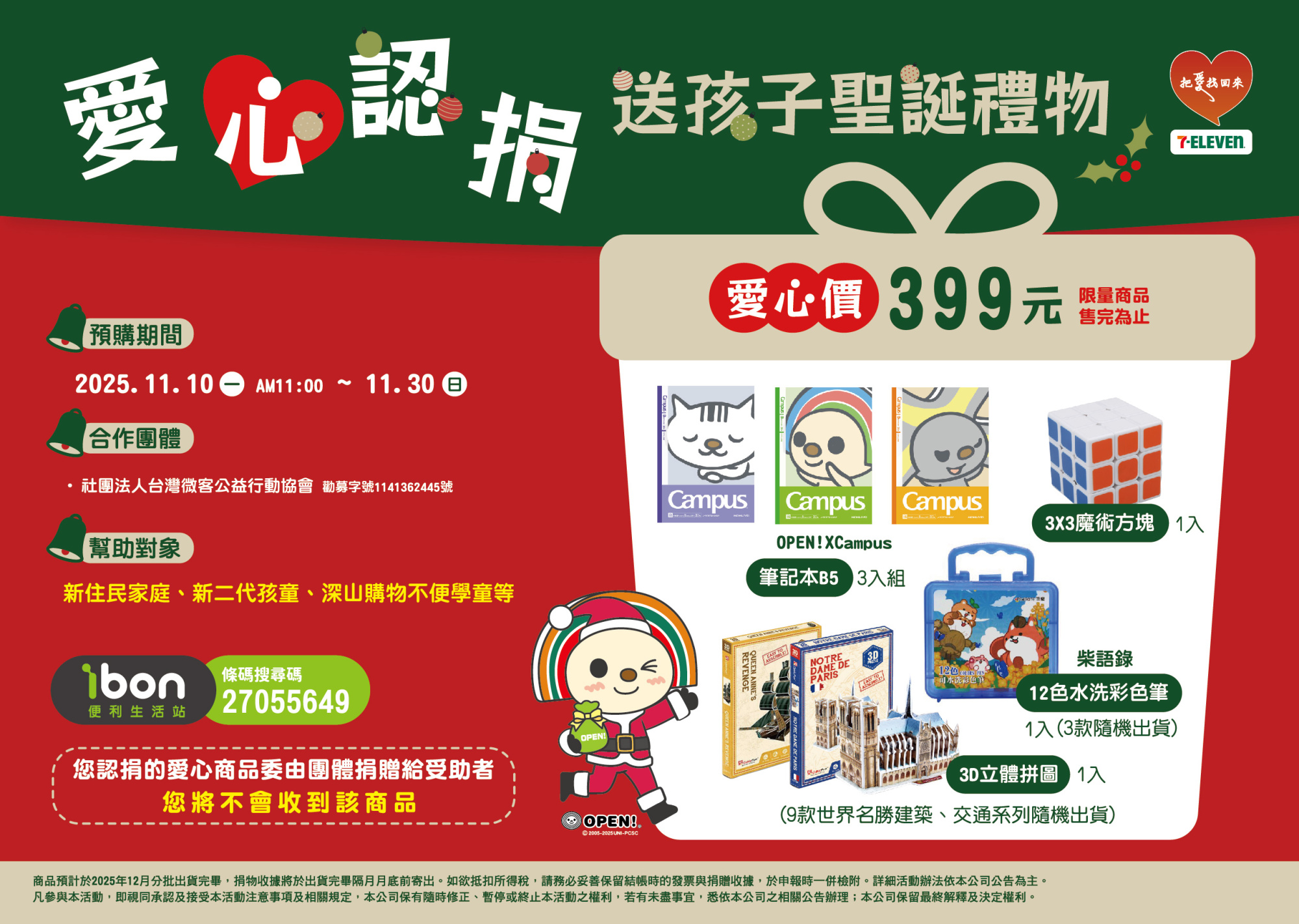 今年聖誕節,微客公益行動協會首次與統一超商集團攜手合作,一起為新住民家庭與孩子,募集能陪伴他們成長的聖誕禮物。