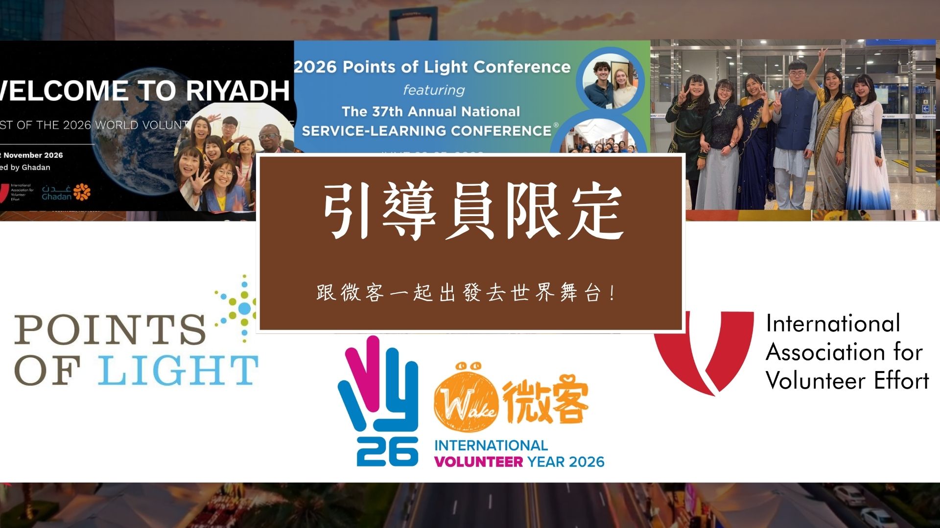 微客和引導員攜手參與國際會議的機會要來啦!集結全世界各個國家的志工組織、學者專家現身說法交流志願服務經驗;響應2026國際志工永續發展年,邀請身為微客引導員的你,帶著獨一無二的觀點和經歷,一起來把故事分享出去!
