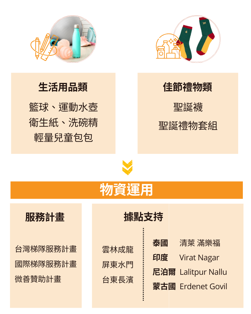 2023年、2024年微客總共媒合了2家企業、1間基金會與1位民眾,進行8次的物資捐贈,內容包含生活用品與佳節禮物。這些物資已於本年全數捐出,用來支持微客服務據點孩子們的日常生活,地點涵蓋台灣與國際的7個據點,詳見圖片內容。