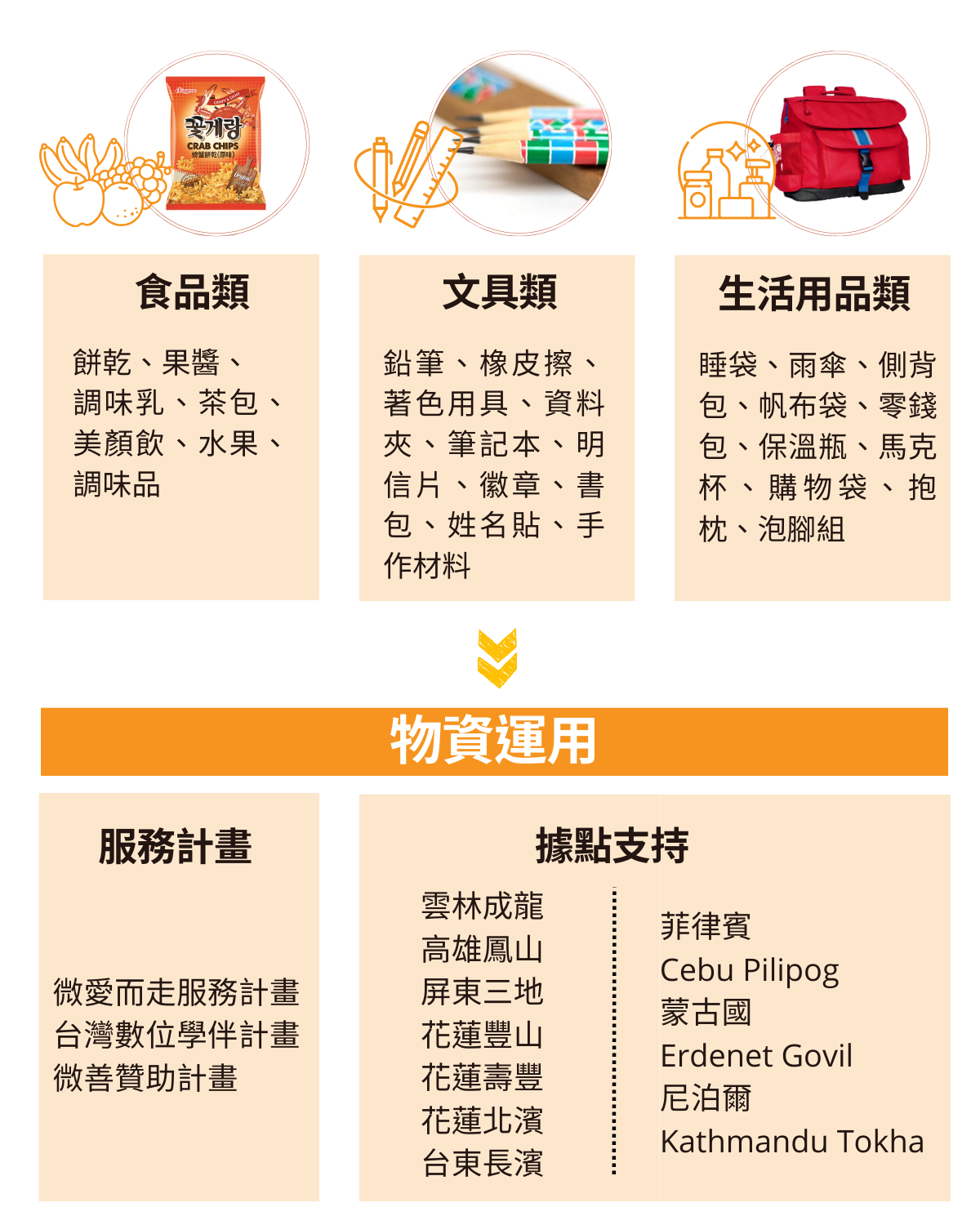 2025年微客總共媒合了12家企業與1間基金會,進行16次的物資捐贈,內容包含食品、文具、生活用品等面向,總計項目多達54種。這些物資已於本年全數捐出,用來支持微客服務據點孩子們的日常生活,地點涵蓋台灣與國際共10個據點,詳見圖片內容。